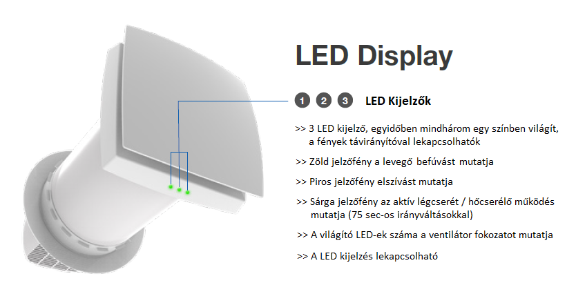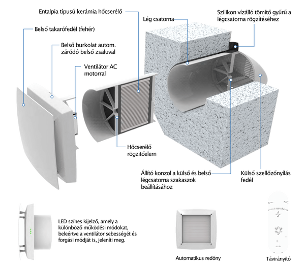 - Fehér színű műanyag ház, kerámia hőcserélővel, automatikusan záródó zsaluval és EC ventilátorral