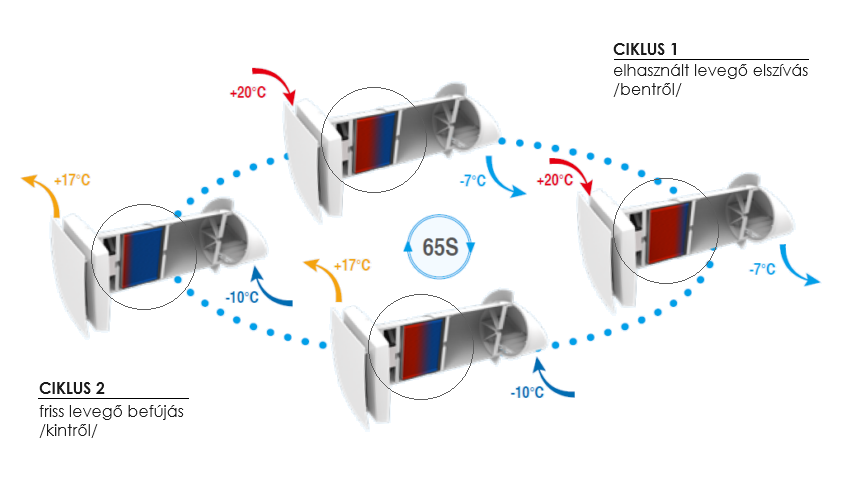 75 másodperces váltakozó ciklusokban,aktív hővisszanyeréssel.