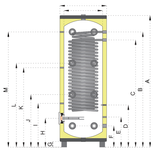 Kiváló és ellenőrzött minőségű rozsdamentes acéllemezből készülő 500 liter űrtartalmú hűtési és fűtési puffer tároló hőszivattyús rendszerekhez. A tartály 50 mm vastagságú, kemény PU szigeteléssel és 0,5 mm vastagságú galvanizált és festett acéllemez külső burkolattal szállított. A puffer tároló kialakítása alapján 90°-os csonkozású, 2 x 4 db, belső menetes 6/4" tartály csatlakozással felszerelt. A rozsdamentes, 22 mm átmérőjű hőcserélő csőspirál duplán feltekert, bemeneti és kimeneti csatlakozása is a tartály felső részén helyezkedik el, a vékony falú csőspirál hatékony hőátadást tesz lehetővé. Padlón álló telepítésre kialakított - alapfelszereltségben támasztó lábakkal szállított.